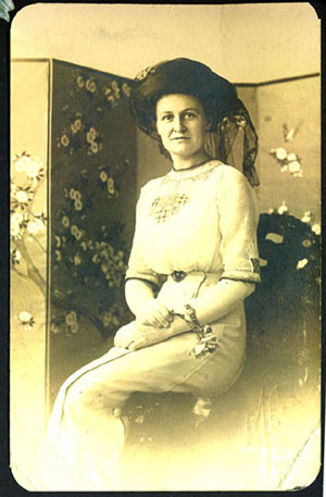 Clara’s “stylish” manner of dress when he met her. There is a studio photograph of Clara seated on a stool, wearing a gauzy, shirtwaist blouse with embroidery on the bodice; a slim, straight skirt and a hat. Lifestyle records report 1908 was the year slim dresses without petticoats became popular. Also, no fashionable woman left her house without a hat in the first decade of the 1900s. Clara was evidently a fashion slave. |